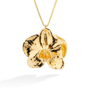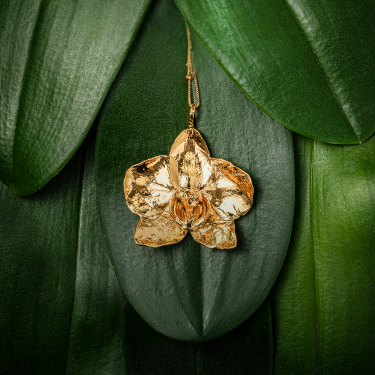 The Blooming Beauty Orquídea Flower Necklace is a stunning expression of Brazilian artistry, handcrafted with precision and plated in 18k gold. Made with a real Orquídea (Orchid - Moth Orchid) flower, its intricate design captures the elegance of nature with its unique, finely detailed look. Carefully crafted by skilled artisans, each piece is a unique work of art, blending timeless craftsmanship with organic sophistication. A true statement of refined beauty, this necklace adds an exclusive and graceful touch to any jewellery collection.