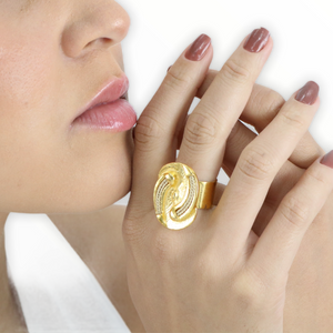 Introducing the captivating 18k gold plated Relax and Rewind Adjustable Ring from our Ethereal Amazonia collection. Crafted to reflect the rich natural beauty of Brazil, the ring embodies a harmonious blend of sophistication and nature’s finest treasures. For a signature look or to elevate any ensemble, the opulent allure of this piece imbues sophistication and individuality. Make your mark with this ethereal embodiment of Amazonia.