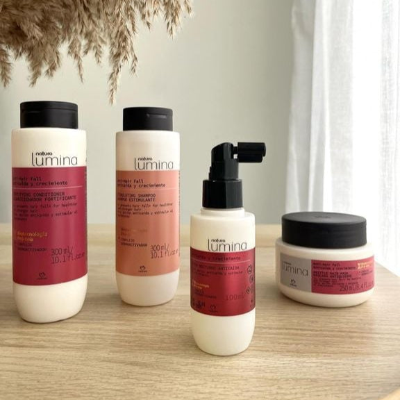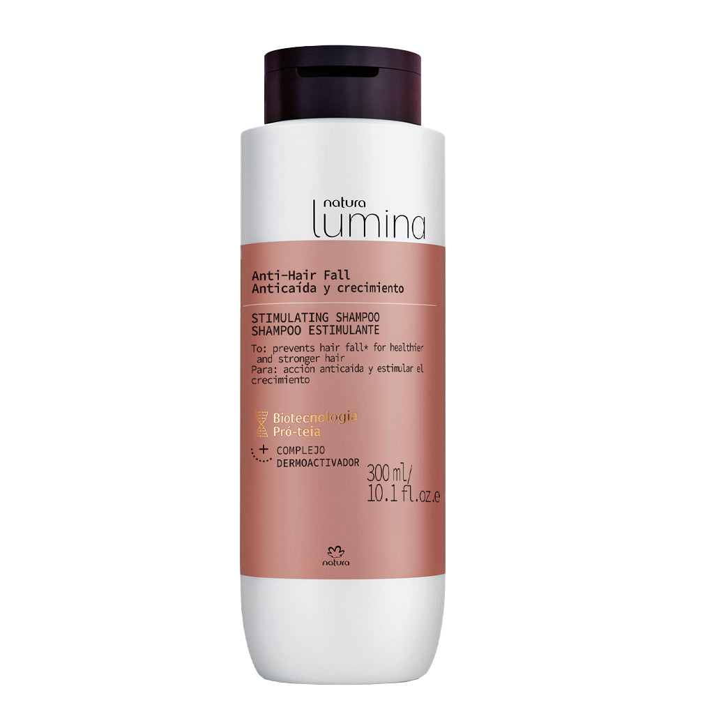 Discover our complete Anti-hair Fall system by Lumina, which acts on six different main loss factors and promotes multiple benefits from the scalp to the strands. Combats loss, thickens and strengthens the strands progressively and increases hair growth. This stimulating shampoo cleanses and stimulates the scalp, preventing hair loss. For greater results, use the complete Lumina Anti-hair Fall system.