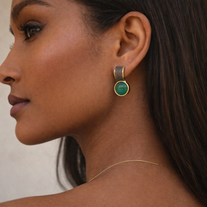 Set in 18k gold plating with dark rhodium accents, these earrings offer a refined contrast that allows the emerald’s rich green to stand out. The classic round shape feels timeless, while the clean lines and thoughtful craftsmanship give the piece a contemporary edge.