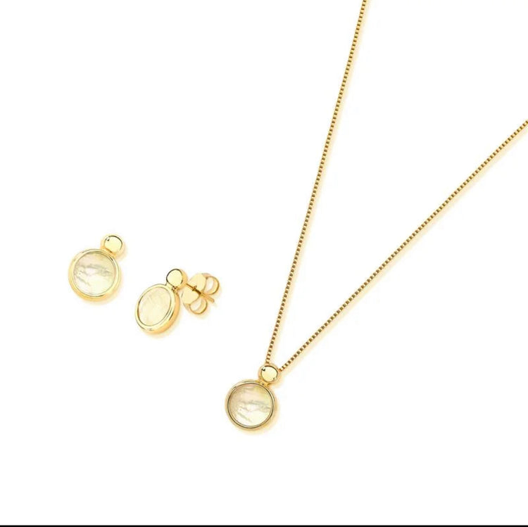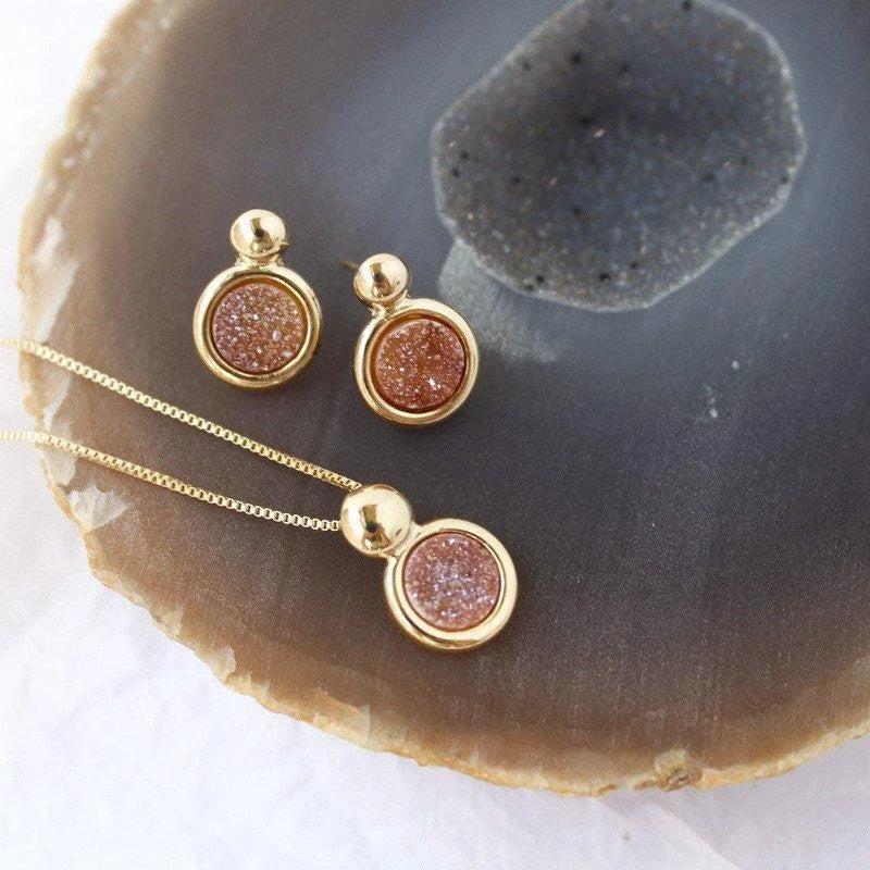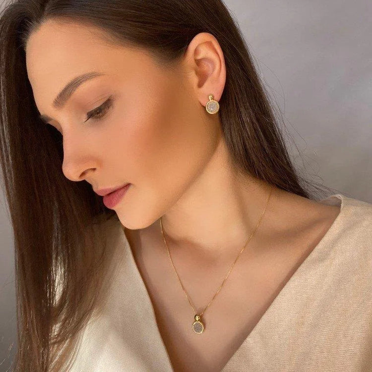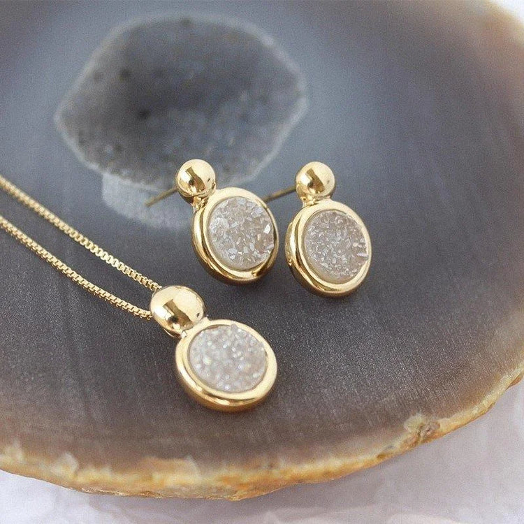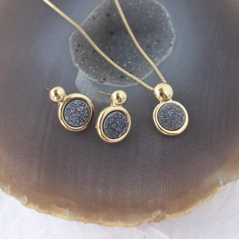 Make an unforgettable statement with the Dancing Gala Earrings and Necklace Set from the TerraFusion Gems collection. Featuring stunning natural druzy stones in beautiful and delicate circular shapes, this set will bring an undeniable charm to any ensemble. Crafted with care, the necklace and earrings are designed to complement each other perfectly, enhancing your look with their radiant beauty. This timeless set will remain a cherished addition to your jewellery collection for years to come.