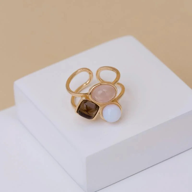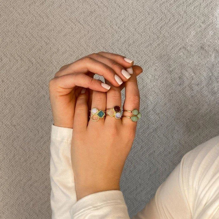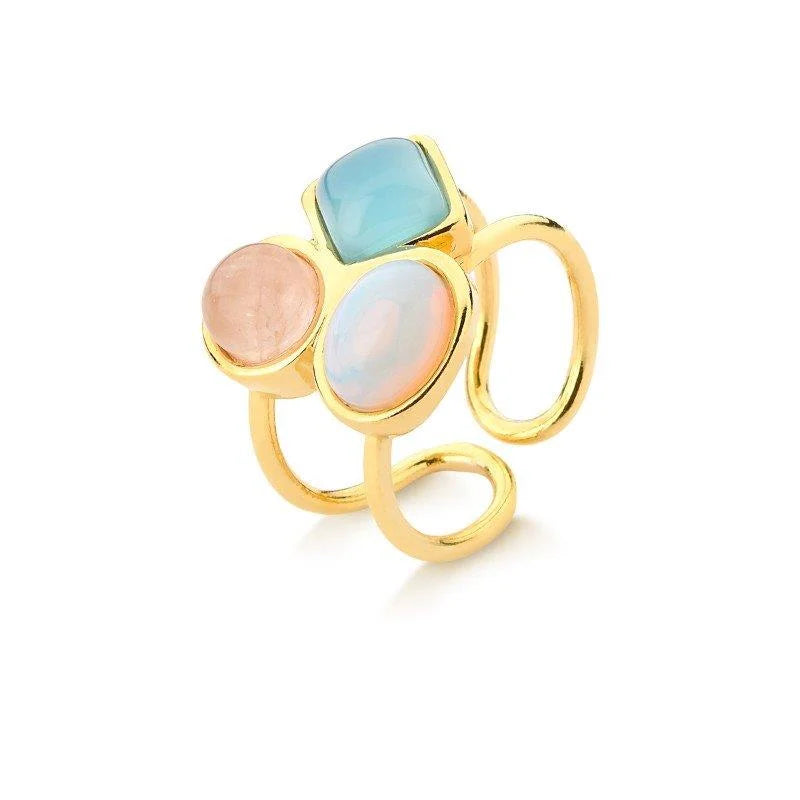 Introducing the Luminous Trio Adjustable Cuff Ring from the TerraFusion Gems collection, a timeless expression of elegance and natural beauty. Each ring features three stunning, hand-selected gemstones. Set in 18k gold plating, this ring offers a perfect balance of luxury and simplicity, making it an ideal accessory for both everyday wear and special occasions. Embrace the beauty and harmony of nature with the Luminous Trio cuff ring, where the richness of Brazilian gemstones meets the refinement of modern design.