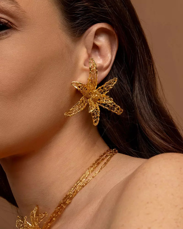 The Blooming Beauty Bromeliads Crochet Maxi Earrings are a stunning showcase of Brazilian craftsmanship, handmade using 18k gold-plated copper wiring. These intricate earrings feature an elegant crochet design inspired by the beauty of Bromeliads. Each piece is carefully crafted by skilled artisans, making them unique, timeless, and a beautiful addition to your jewellery collection.