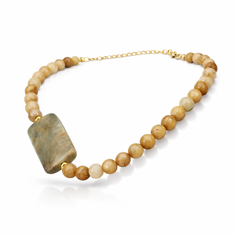 This necklace is handcrafted using smooth, natural Jasper beads, centred around a striking rectangular Jasper stone that immediately draws the eye. The soft variations in tone — from warm sandy hues to deeper forest greens — create a calm, natural palette that feels effortless and timeless.