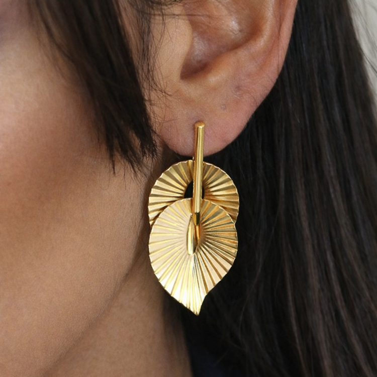Handcrafted using delicate fibres from the Amazonian Buriti palm, these earrings feature layered, abstract shapes finished with 18k gold plating. Their softly sculptural silhouette catches the light beautifully, making them an effortless choice for both everyday wear and special occasions.